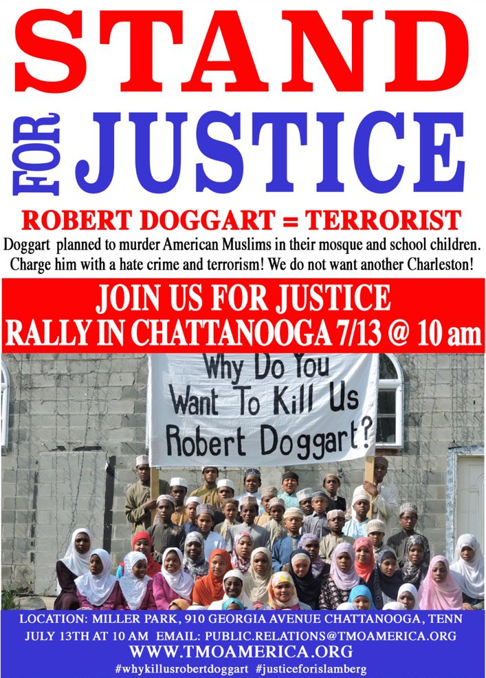 The event is being held at Miller Park, 910 Georgia Ave., Chattanooga, TN, beginning at 10 o’clock am, in proximity to the court venue where would-be mass murderer Robert Doggart will be arraigned before Magistrate Judge Susan K. Lee at 2 PM. Doggart is being arraigned in connection with his plot to organize a private militia of trained gunmen to burn down the place of worship and school belonging to the Muslim community of Islamberg in upstate NY, and to “annihilate” any who attempted to stand in their way using an M4 rifle, explosives, snipers and a machete.